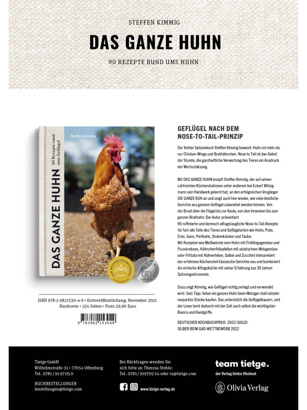 Geflügel ist so viel mehr als Brathähnchen und Weihnachtsgans, das beweist Spitzenkoch und Autor Steffen Kimmig in seinem neuen Nose-to-tail-Buch „Das ganze Huhn. 90 Rezepte rund ums Geflügel“. Anknüpfend an den großen Erfolg seines Erstlingswerks „Die ganze Kuh. 90 Rezepte für Fleischschmecker“ zeigt Kimmig, wie köstlich alle Teile des Geflügels sind – aus Leidenschaft für außergewöhnliche Rezeptideen und aus Wertschätzung dem Tier gegenüber.